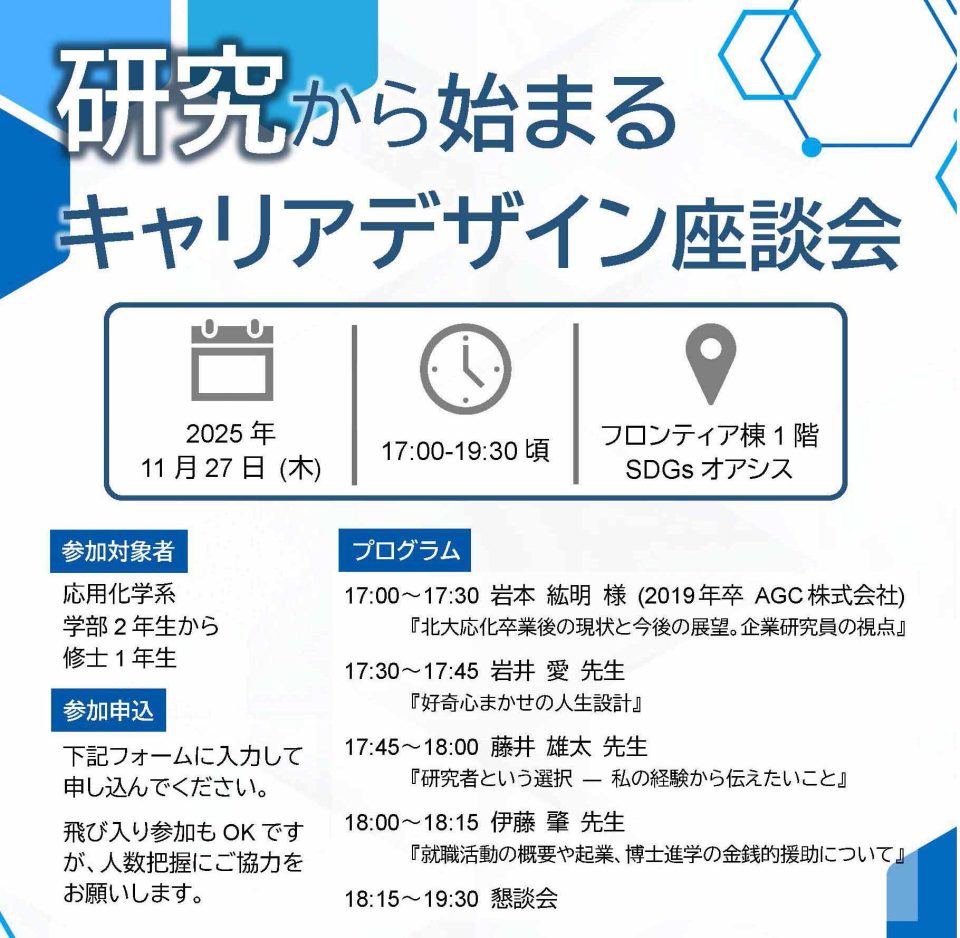 2025年11月27日(木)の17時より卒業生を招いて応用化学コースの学生向けに「研究から始まるキャリアデザイン座談会」を開催しました。