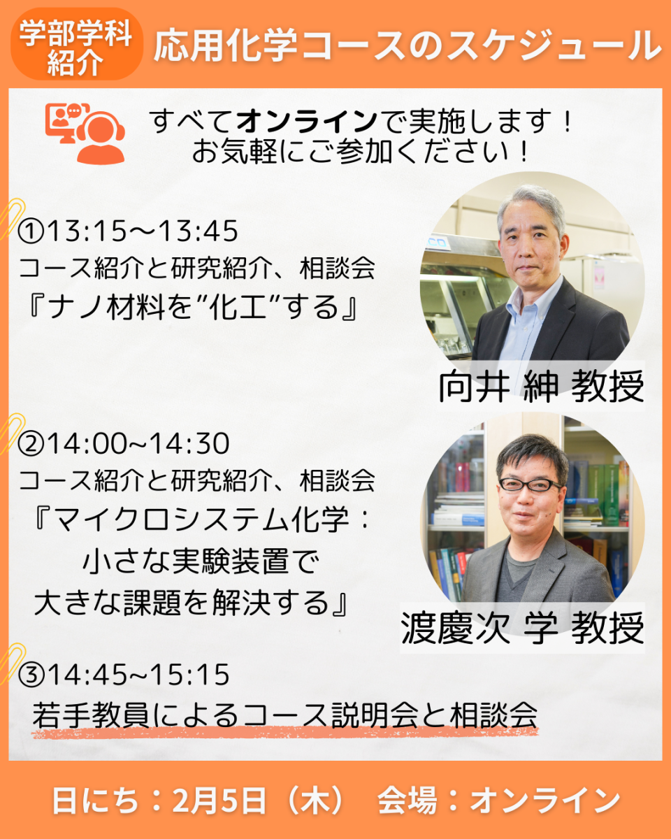 2026年2月5日 (木) の 学部一年生向けの学科紹介で、応用化学コースでは以下のスケジュールで説明会と相談会をオンライン (Google meet) で行います。